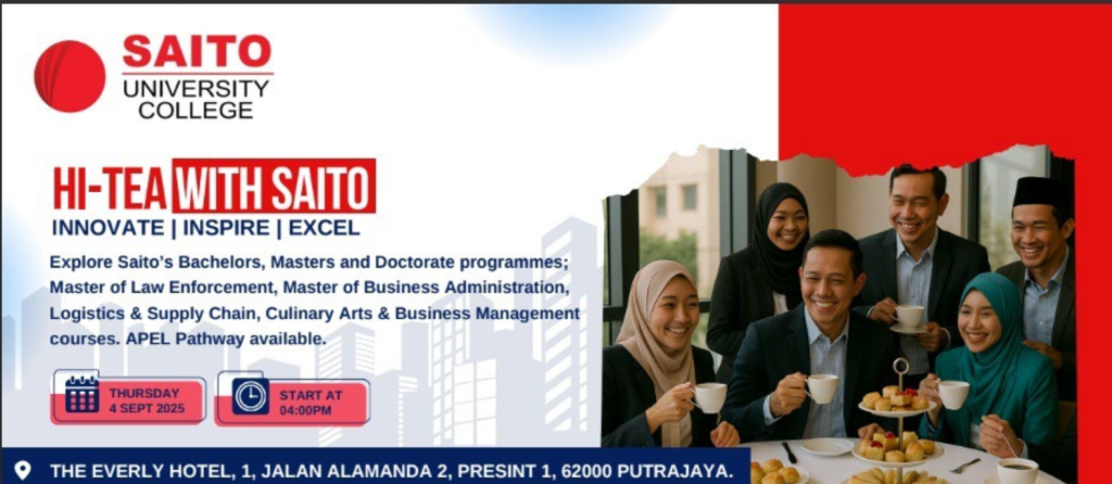 Let’s explore an abundant of opportunities at Saito University College’s Hi-Tea With Saito at The Everly Hotel Putrajaya on September 4, 2025. Everyone is welcome to the possibilities of Shaping Futures with Saito, a venue where Education Empowers, especially the working individuals seeking to further their studies and enhance their chances for promotions. A Mini […]